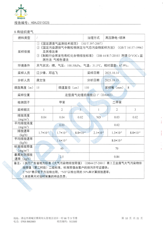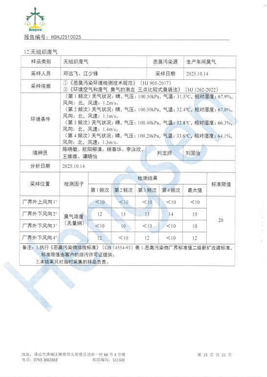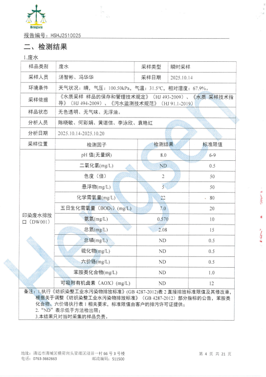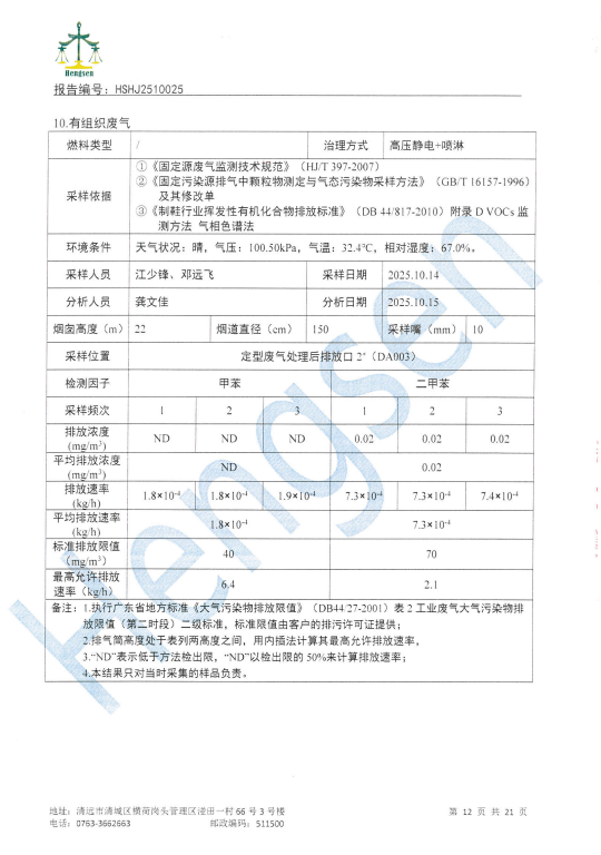 清远万家丽高新科技有限公司2025年10月份废水、废气、噪声检测报告