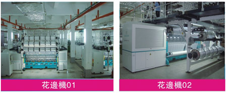 machinery and equipment: All Group all lace machinery and equipment imported from Germany Kaer Mai, there are 25bar, 31bar, 32bar, 42bar, 43bar, 53bar, 59bar, 65bar, 78barvariety of models to meet the needs of different flowers. Germany the EAT, TEXION company has introduced design software.