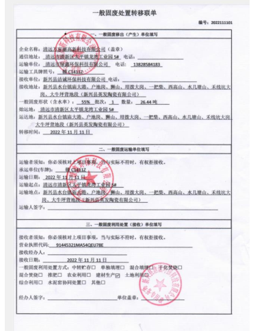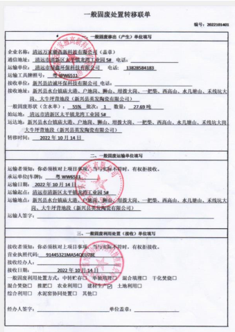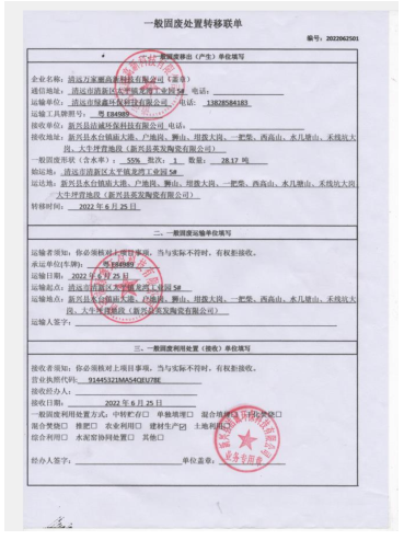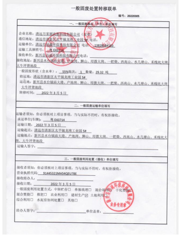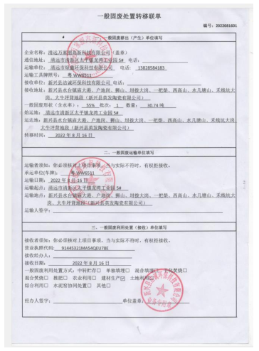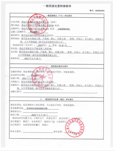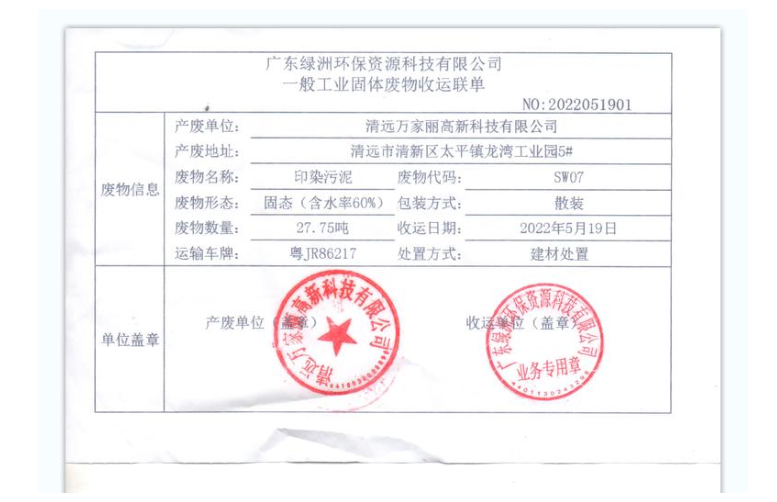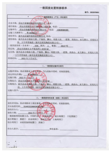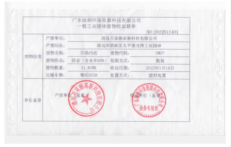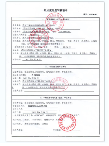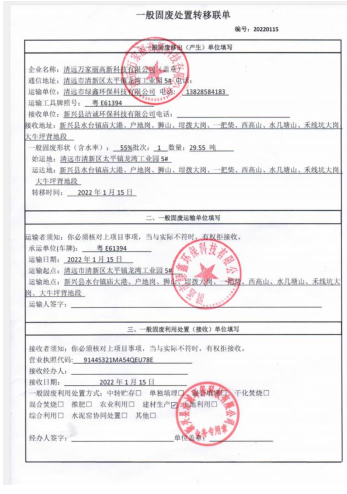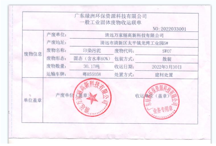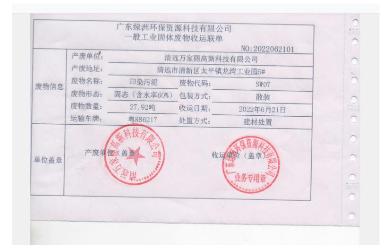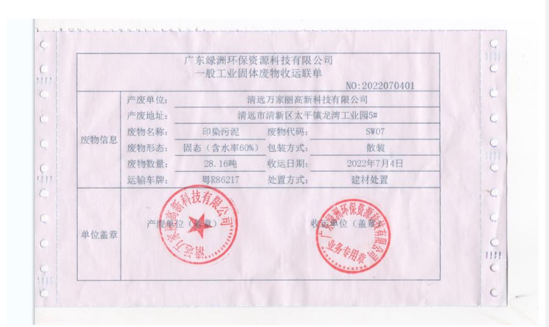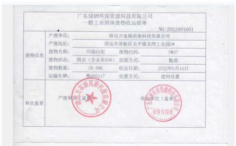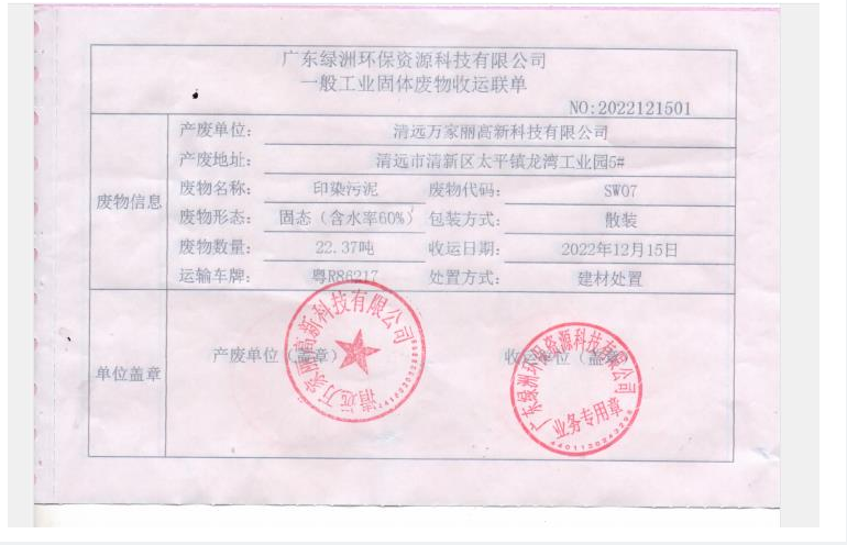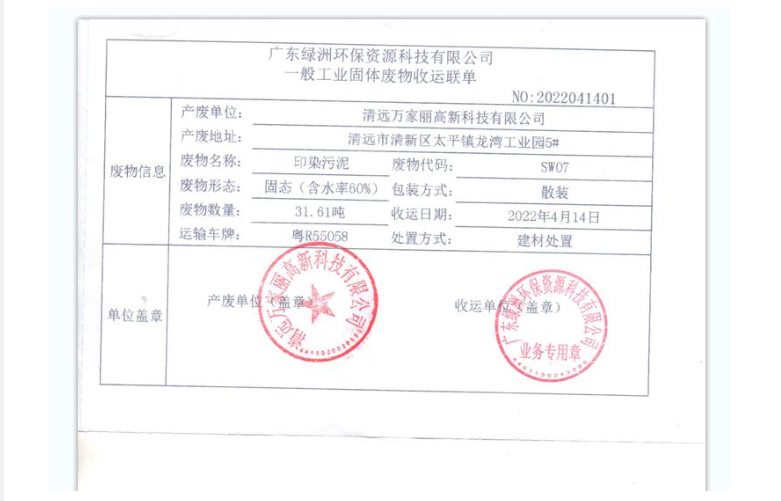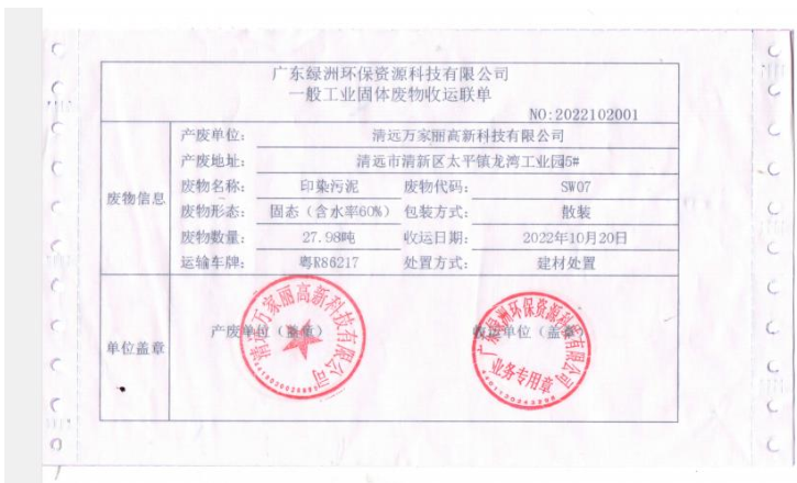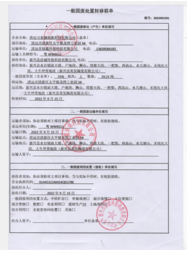 2022年度万家丽高新科技有限公司污泥转移联单