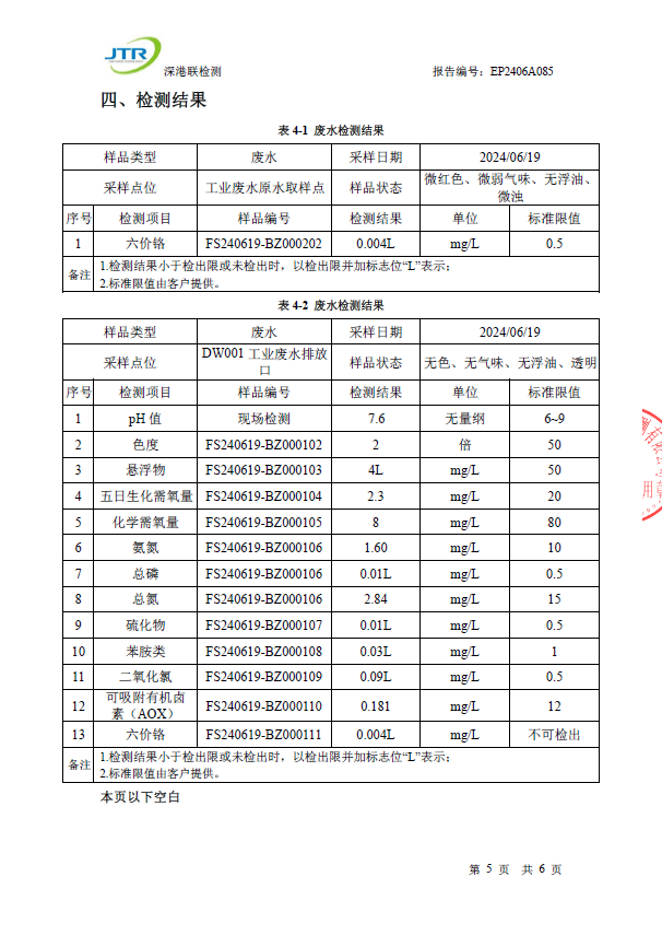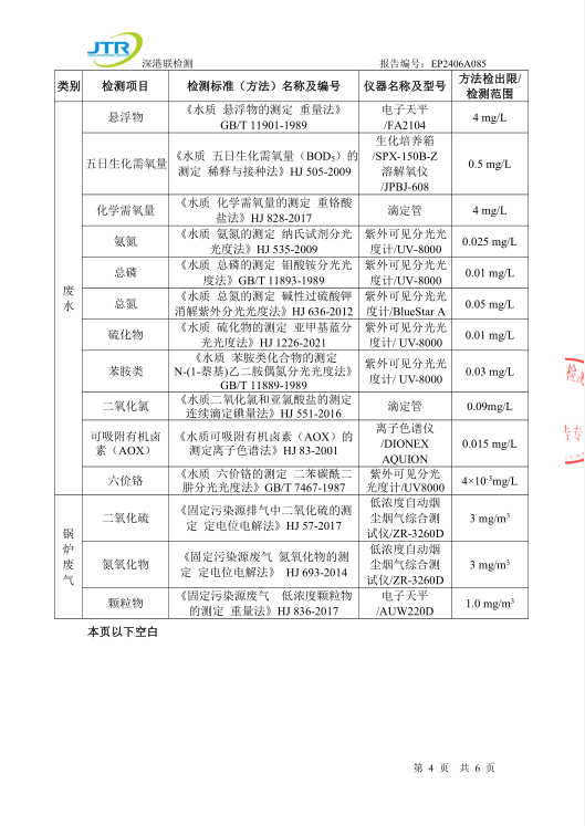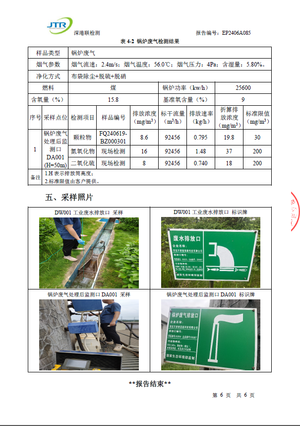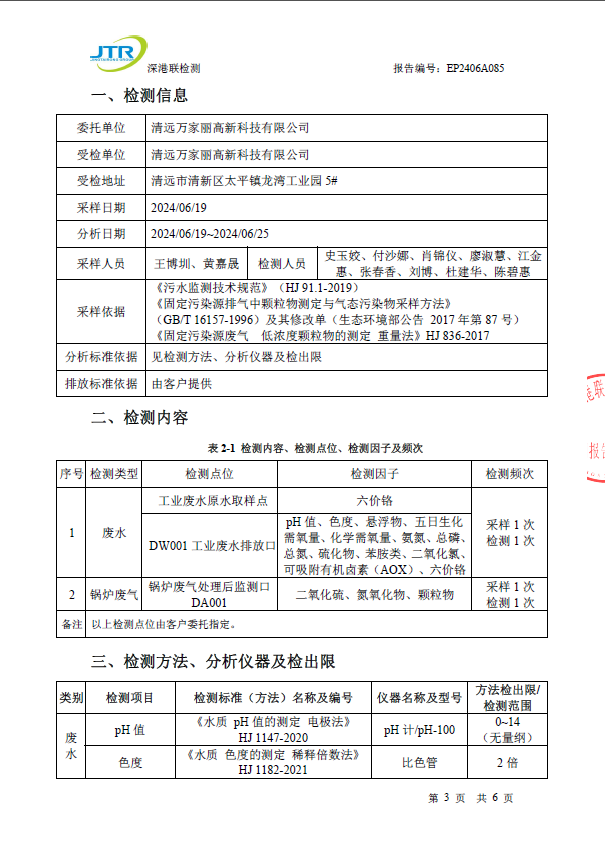 清远万家丽高新科技有限公司2024年6月份废水、锅炉废气监测报告