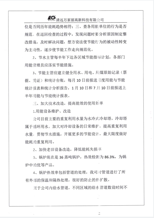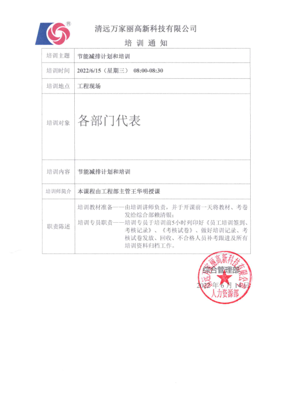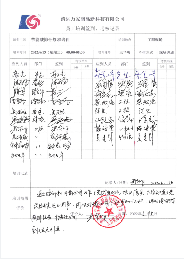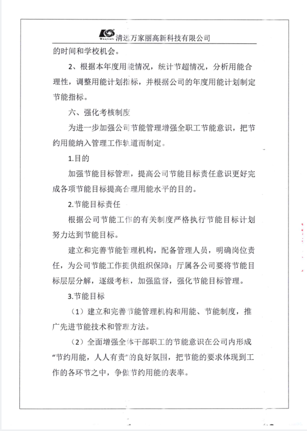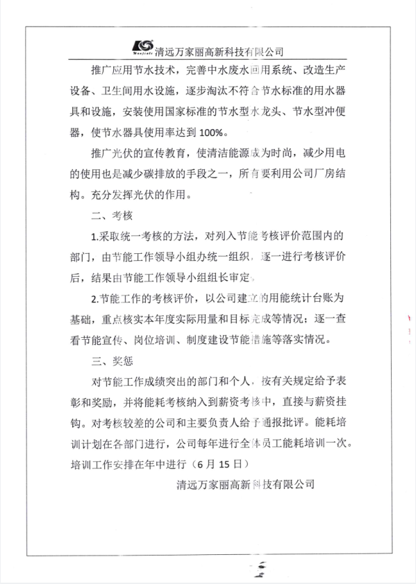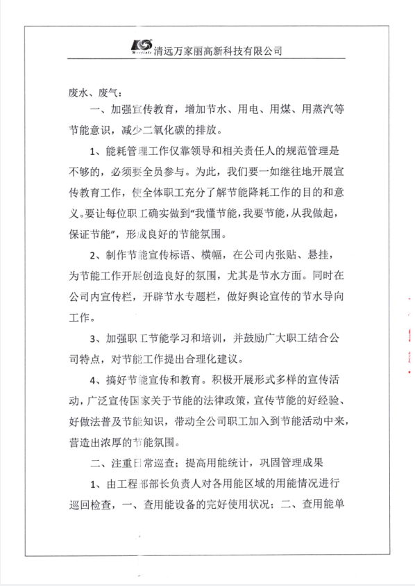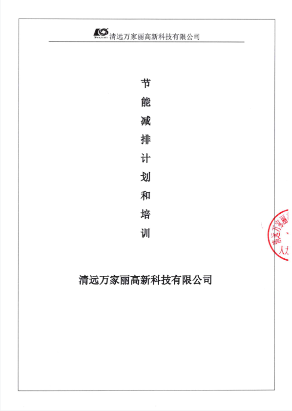 清远万家丽高新科技有限公司,内部节能减排计划和培训