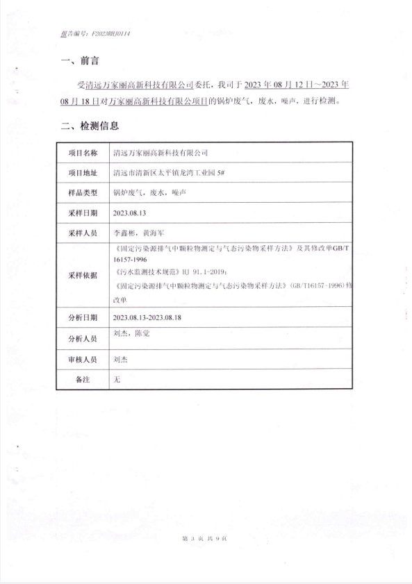 清远万家丽高新科技有限公司2023年度8月份废水、锅炉废气监测报告