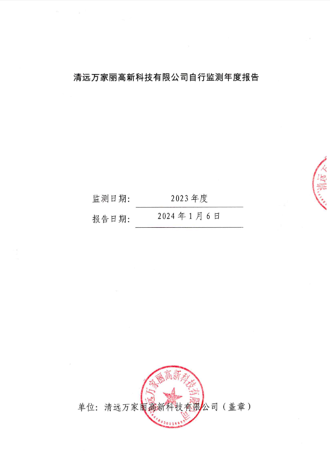 2023年清远万家丽高新科技有限公司自行监测年度报告