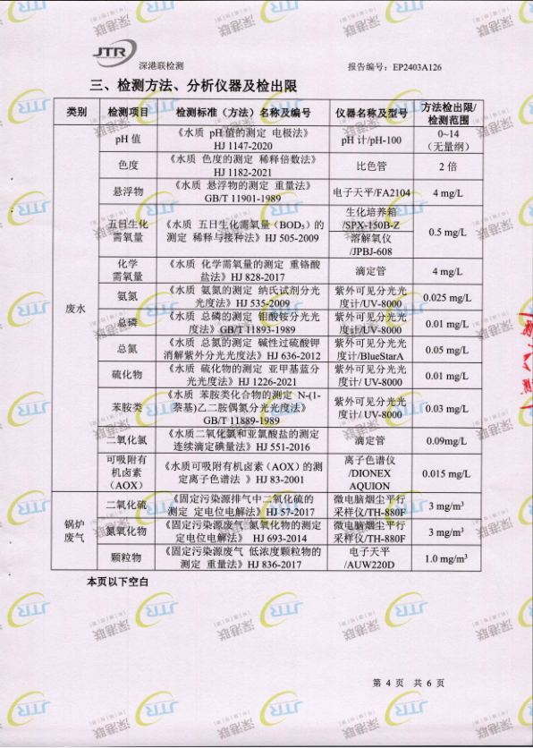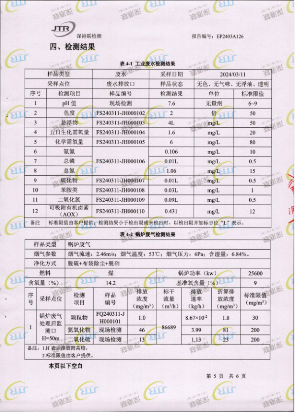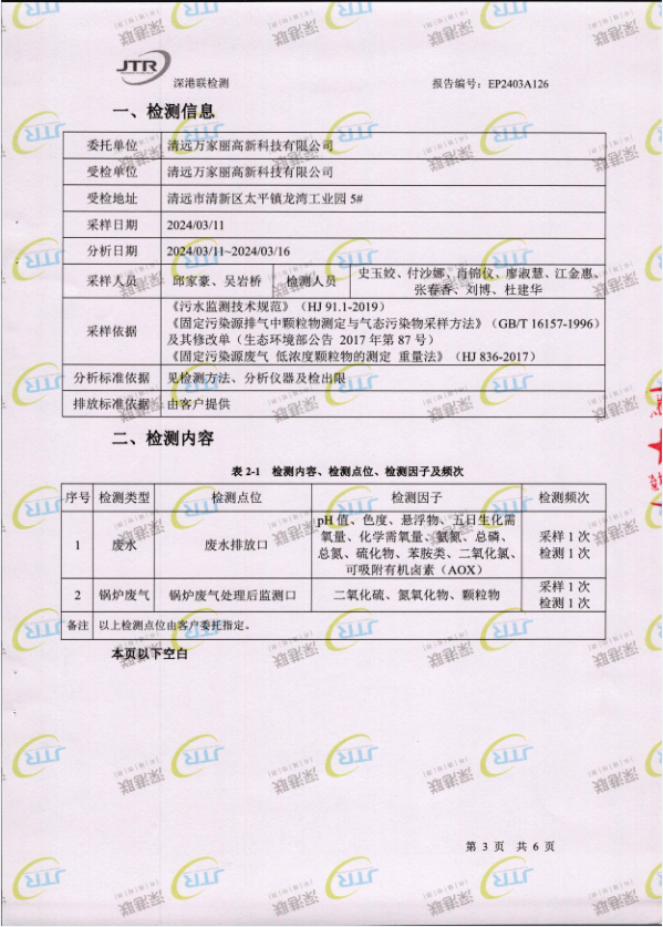 清远万家丽高新科技有限公司2024年3月份废水、锅炉废气监测报告
