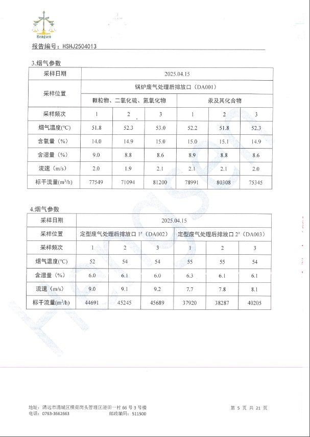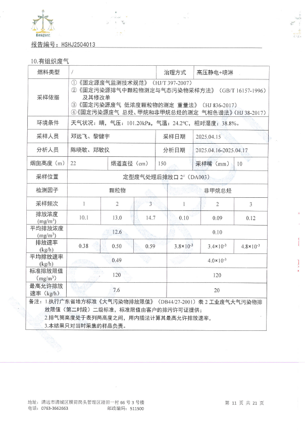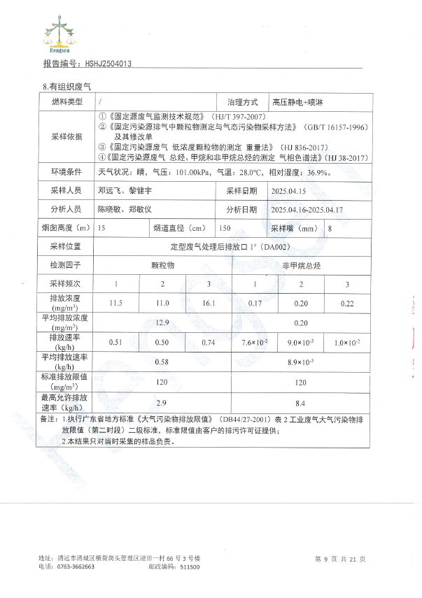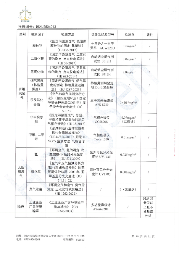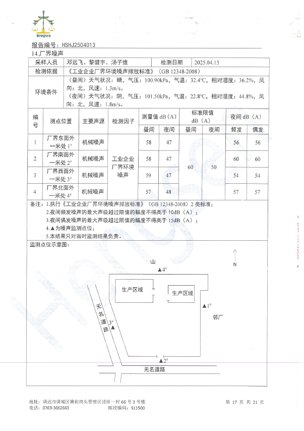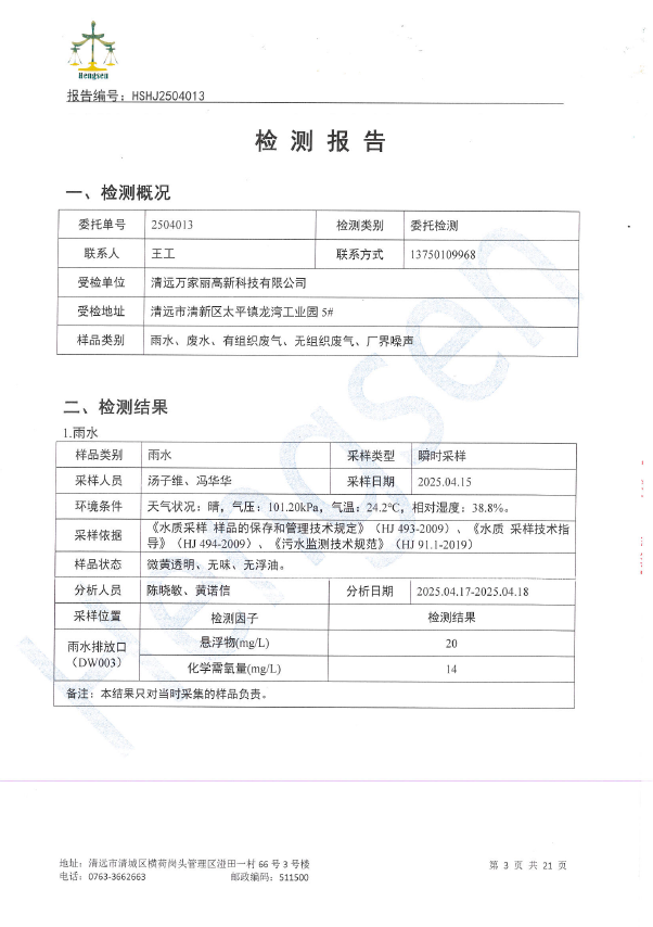 清远万家丽高新科技有限公司2025年4月份废水、废气、噪声检测报告