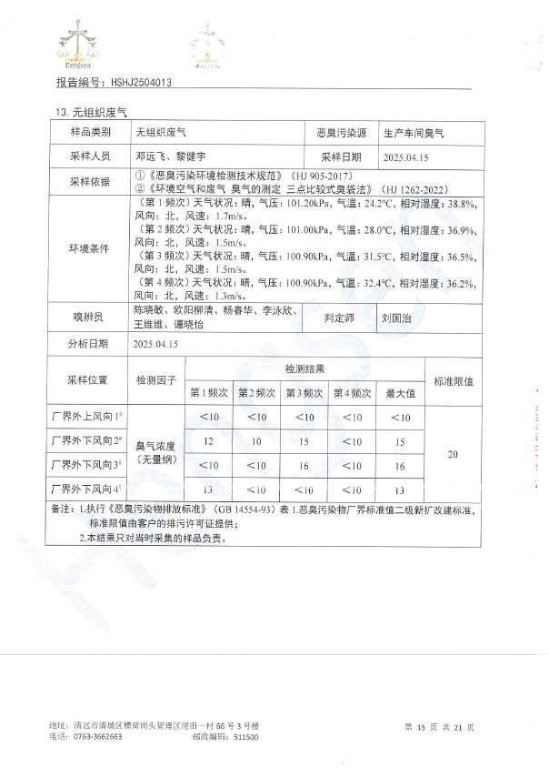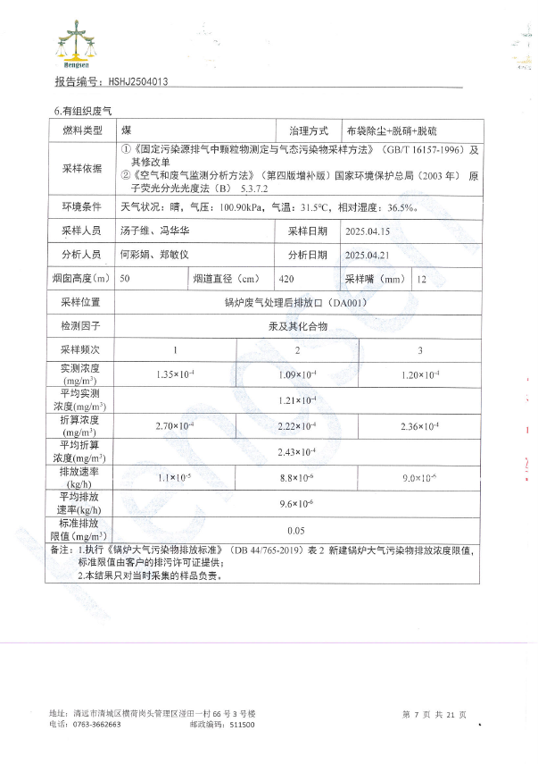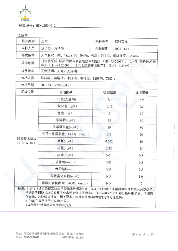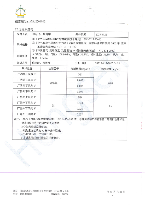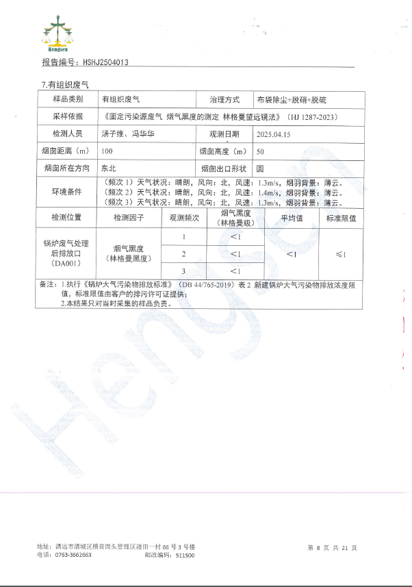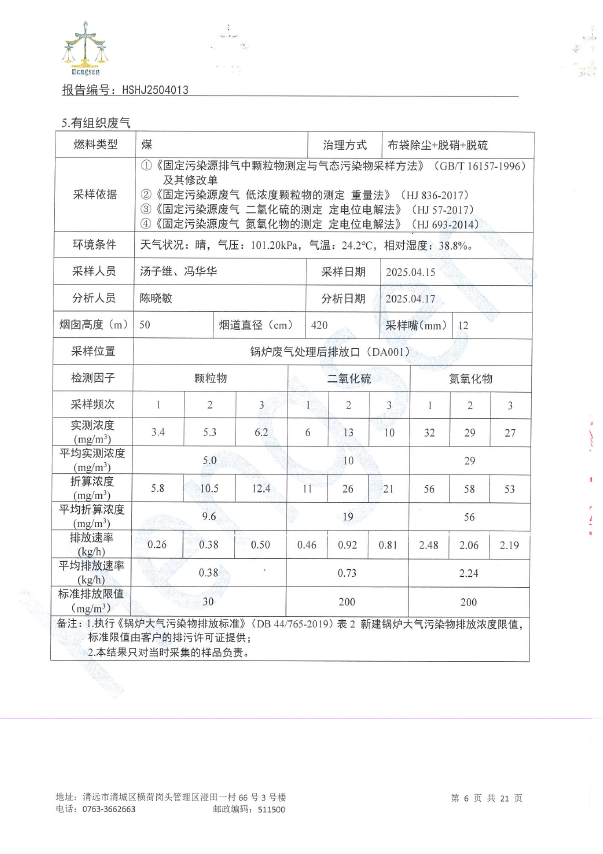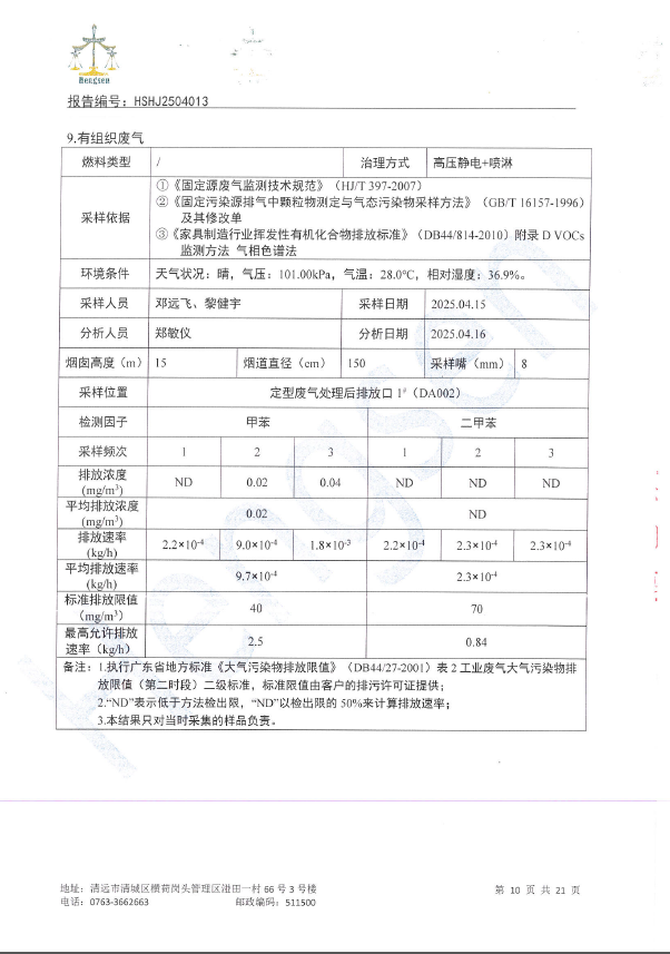 清远万家丽高新科技有限公司2025年4月份废水、废气、噪声检测报告
