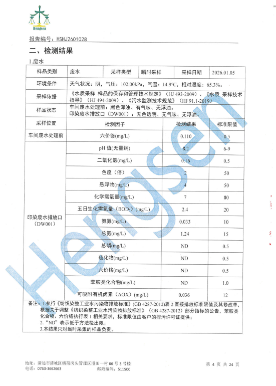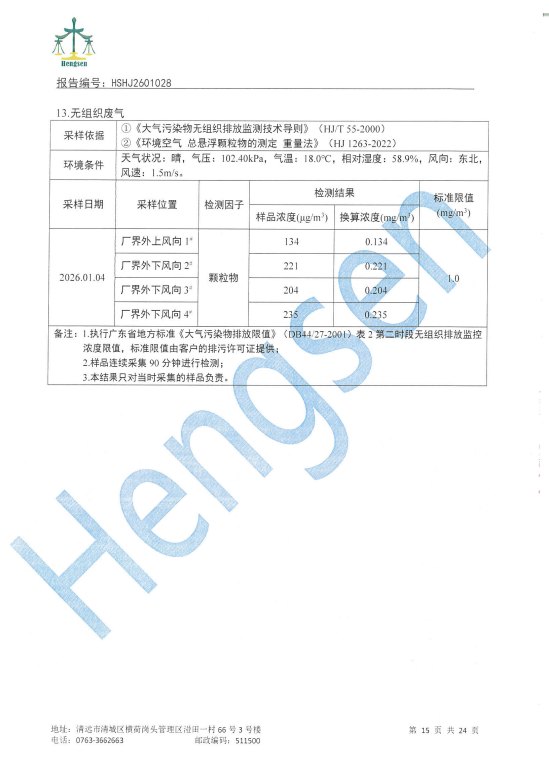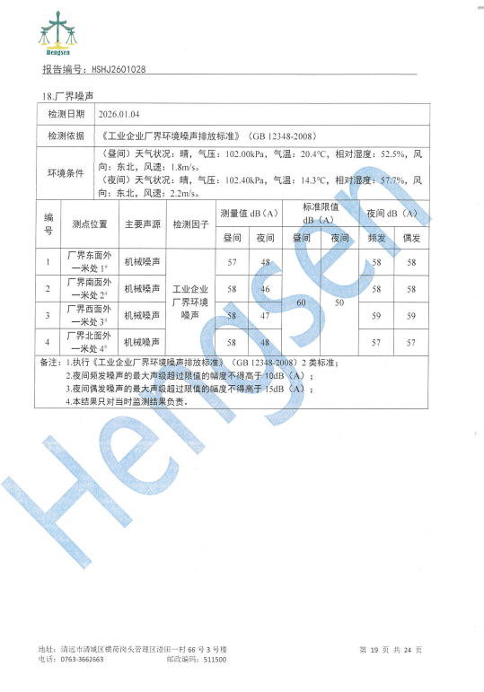 清远万家丽高新科技有限公司2026年1月份废水、废气、噪声检测报告