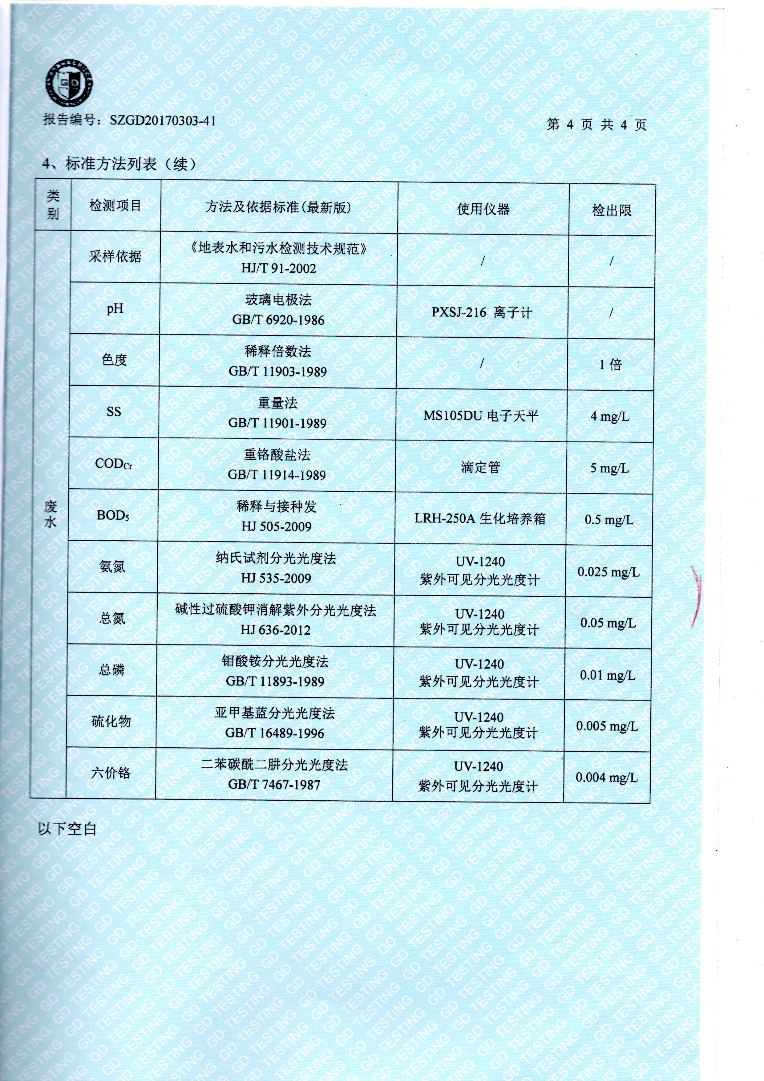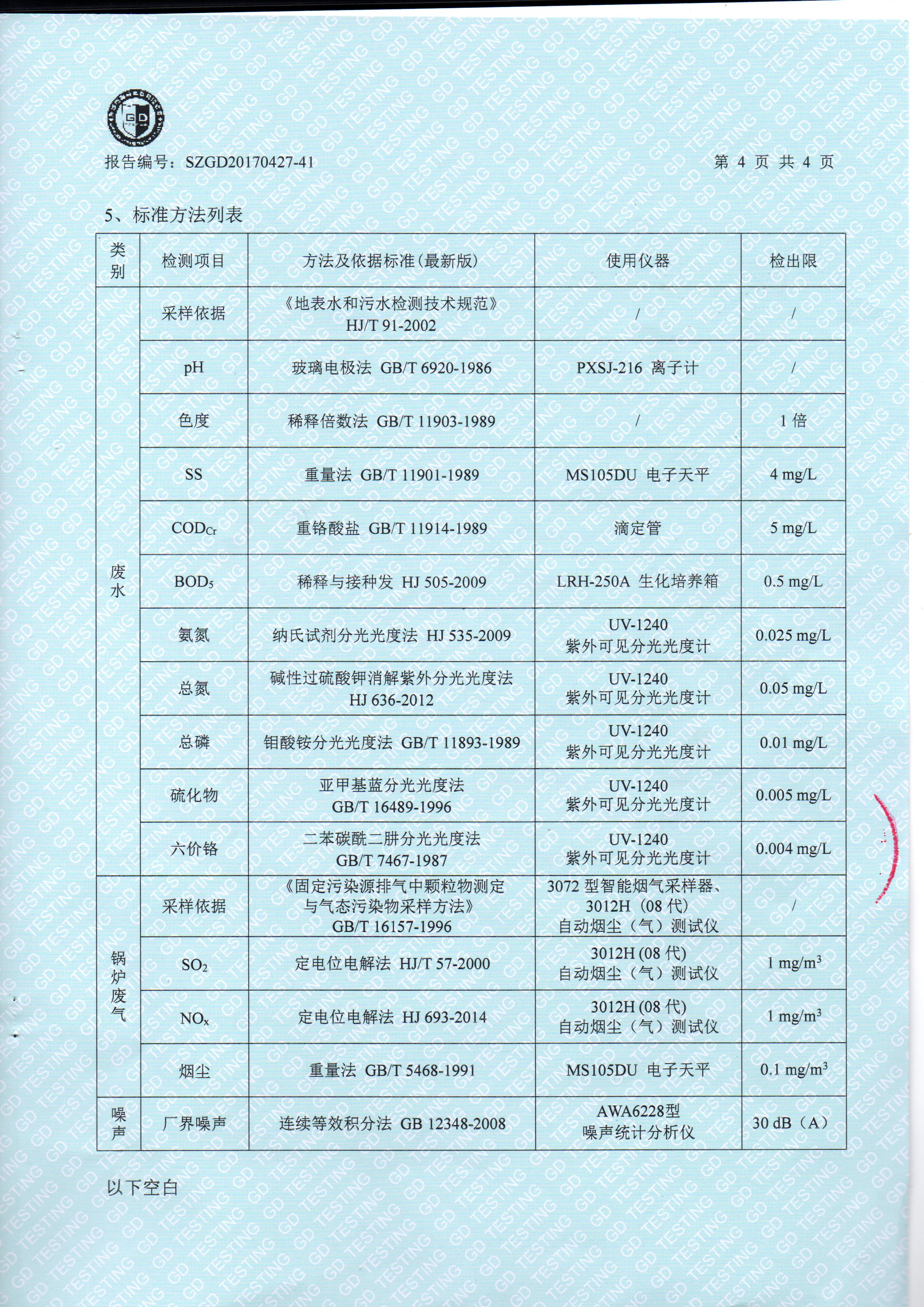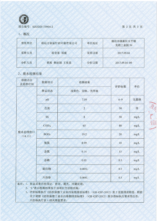 清远万家丽高新科技有限公司2017年废水检测通过了国家各项环保检测