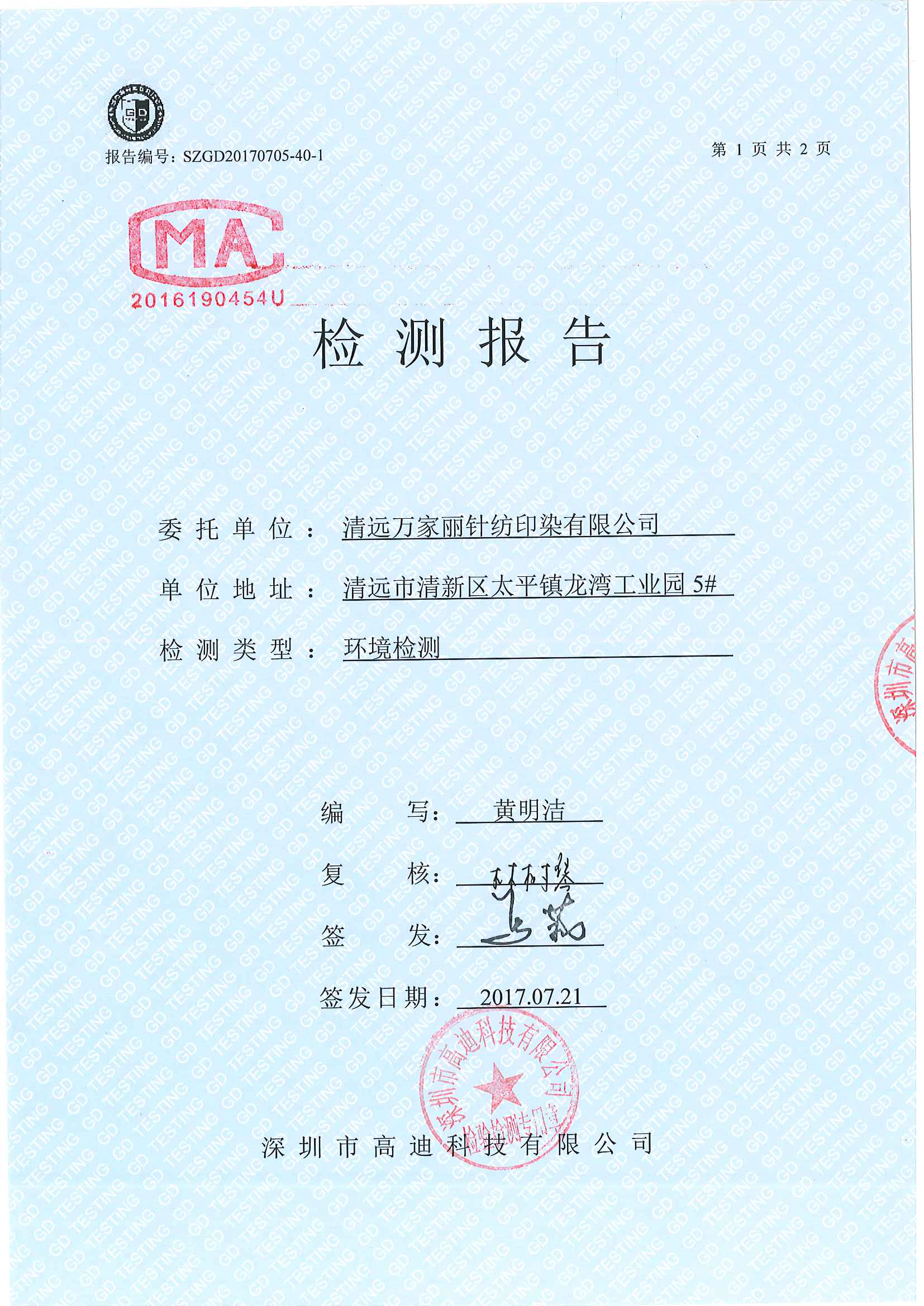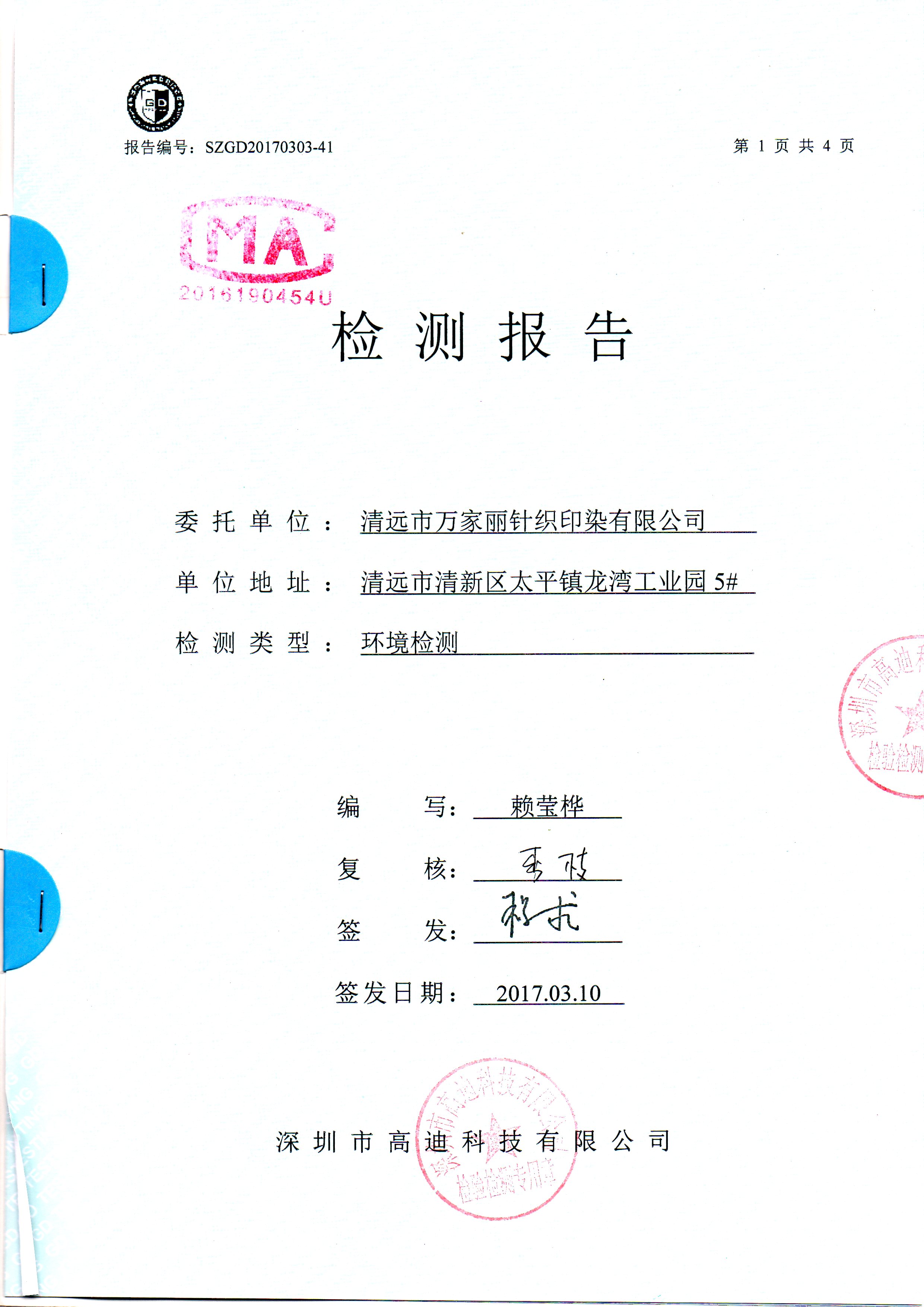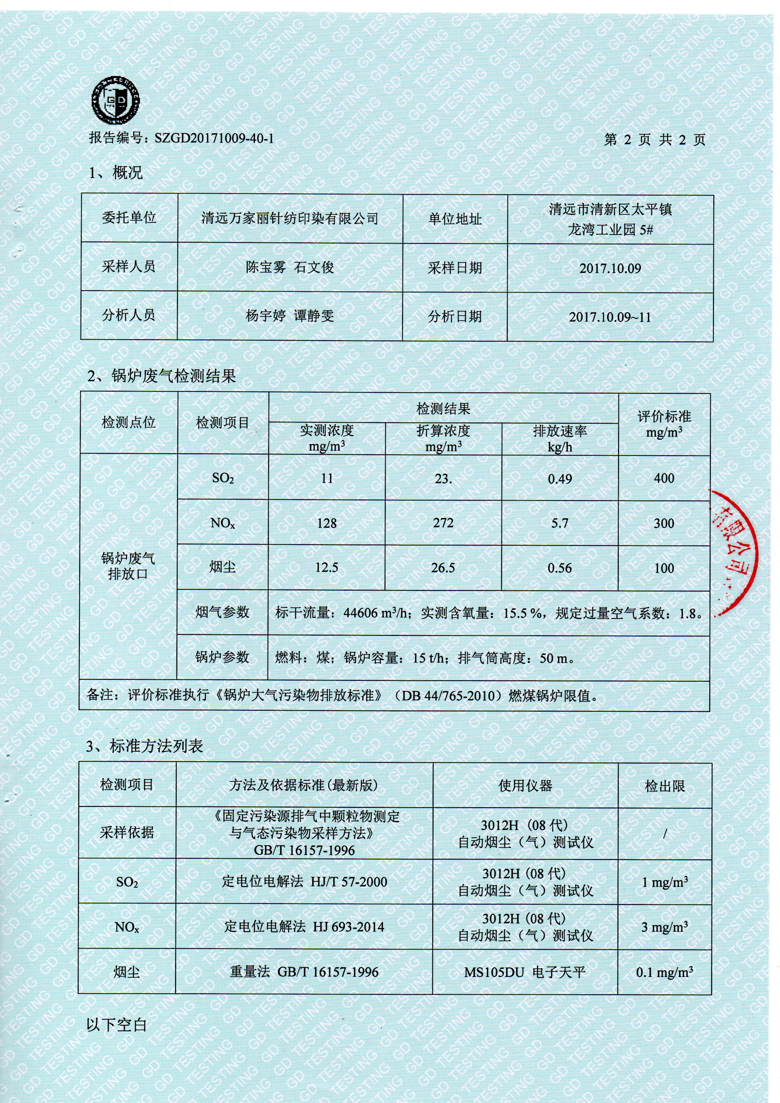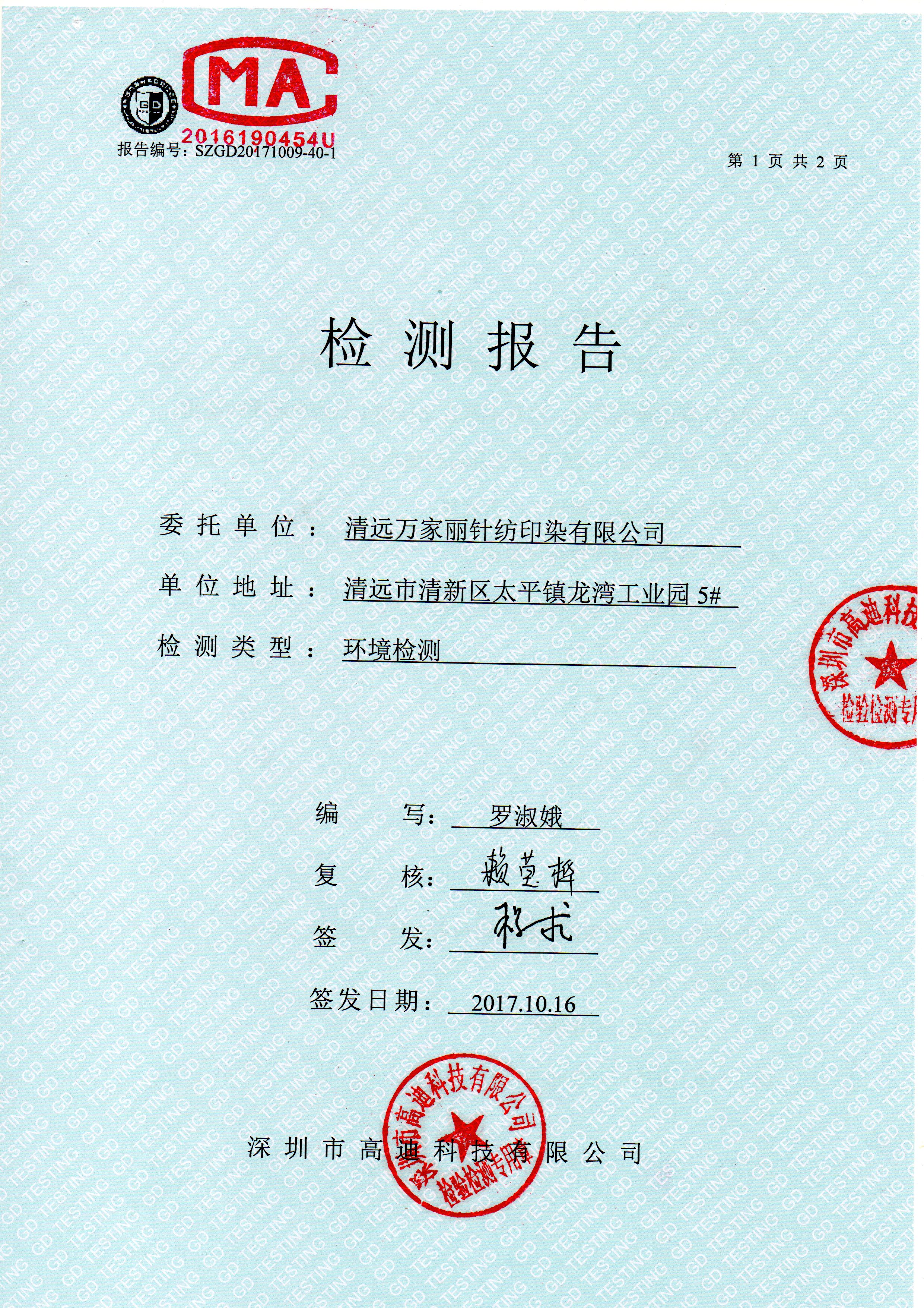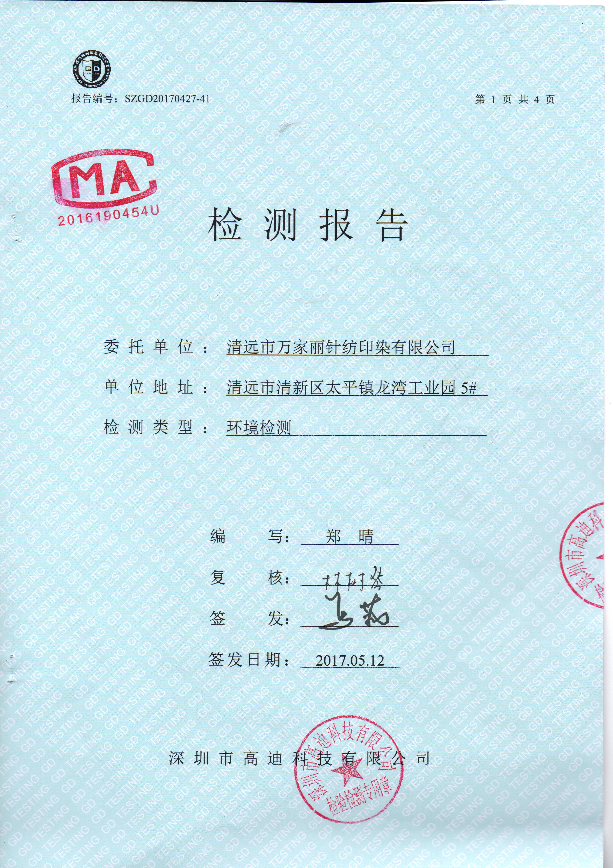 清远万家丽高新科技有限公司2017年废气检测通过了国家各项环保检测