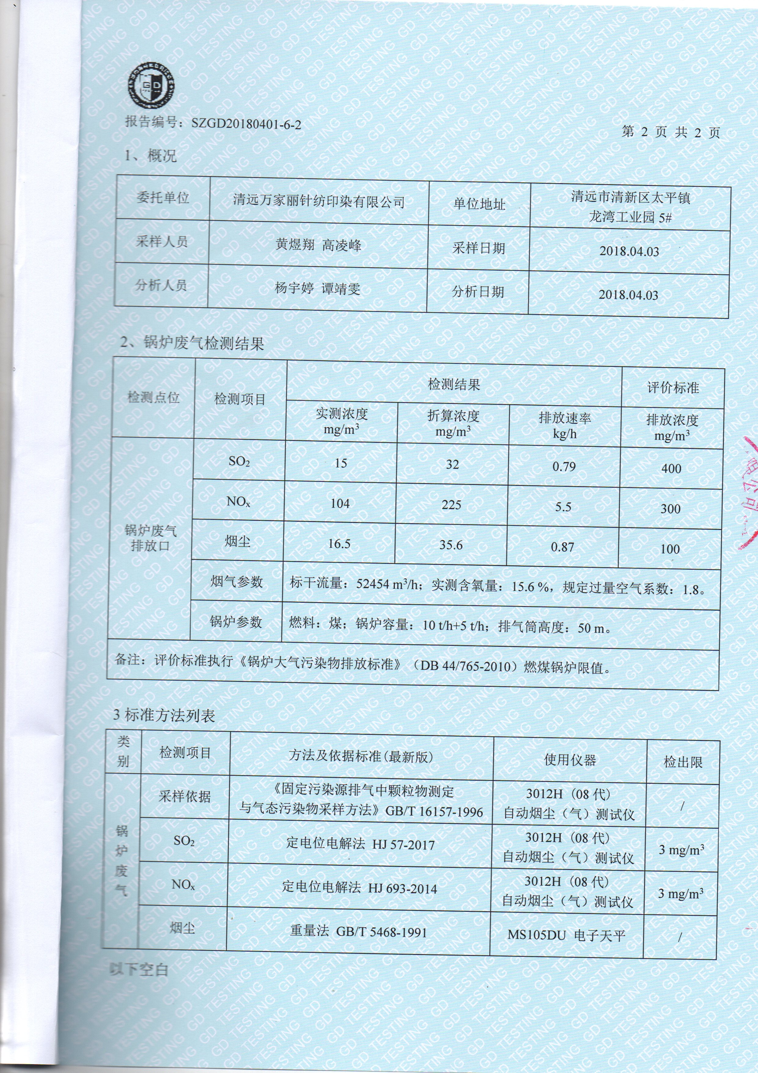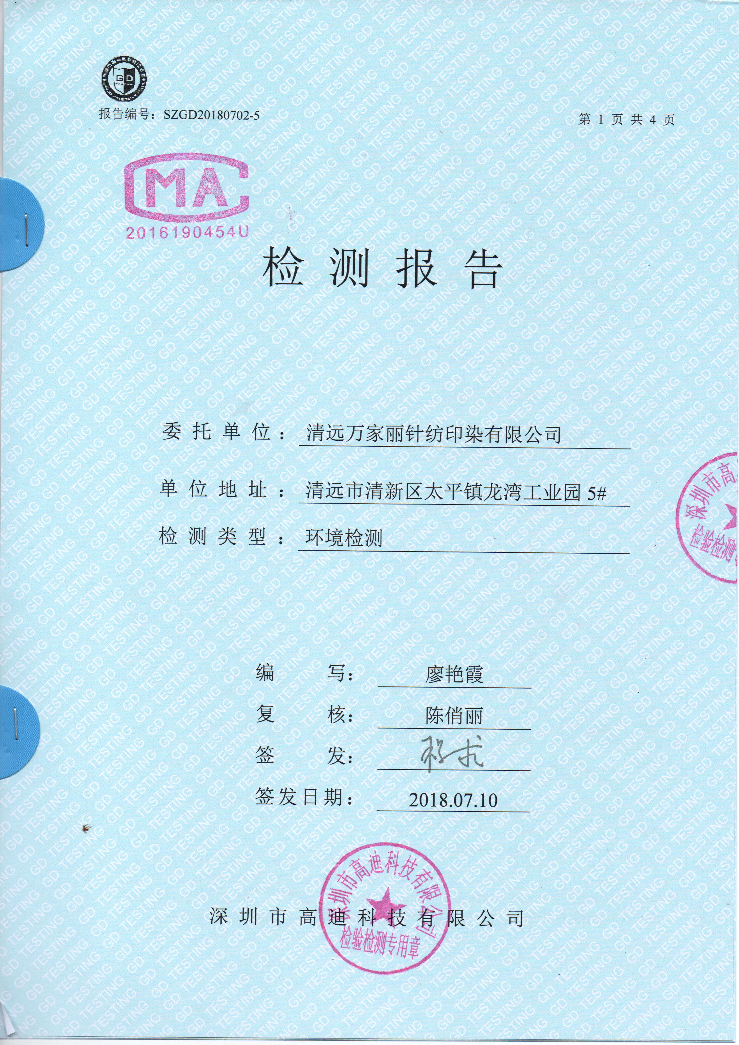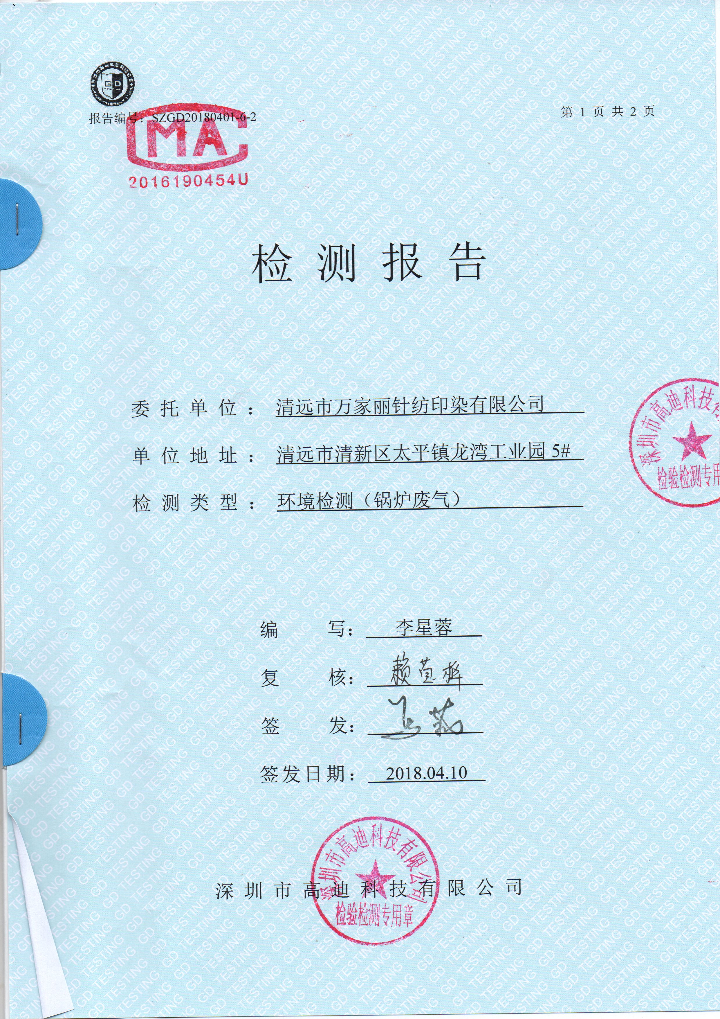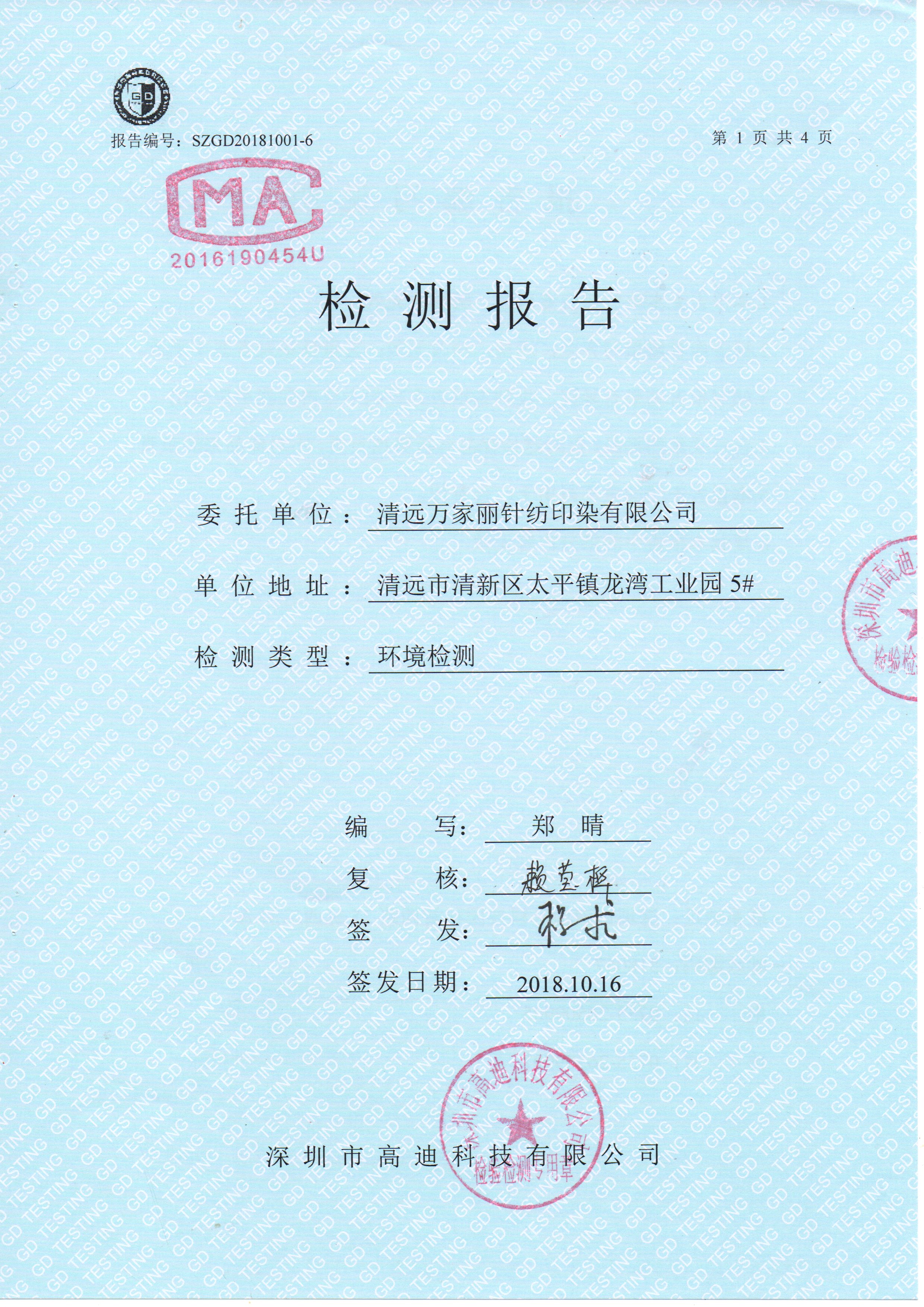 清远万家丽高新科技有限公司2018年废气和噪声检测通过了国家各项环保检测