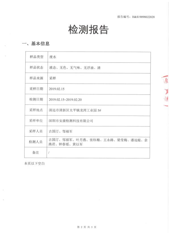 清远万家丽高新科技有限公司2019年废水检测通过了国家各项环保检测