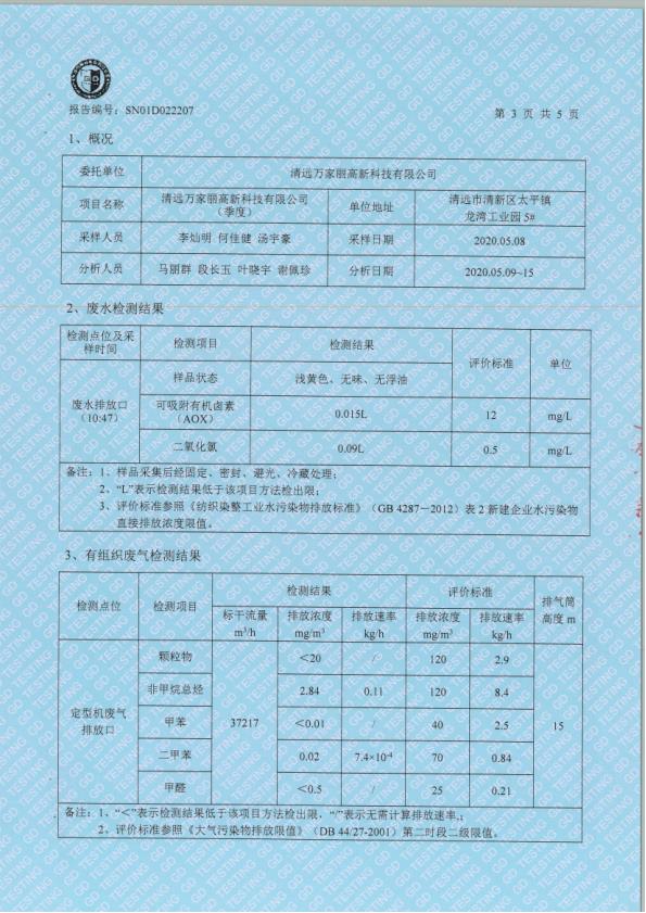 清远万家丽高新科技有限公司2020年2季度定型有机废气、噪声、废水