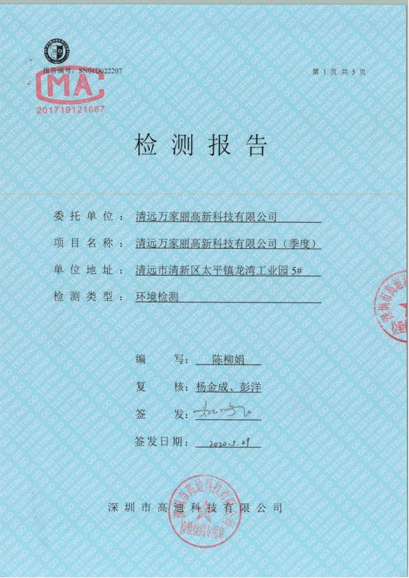 [下一篇] 清远万家丽高新科技有限公司2020年5月废水