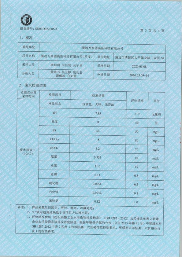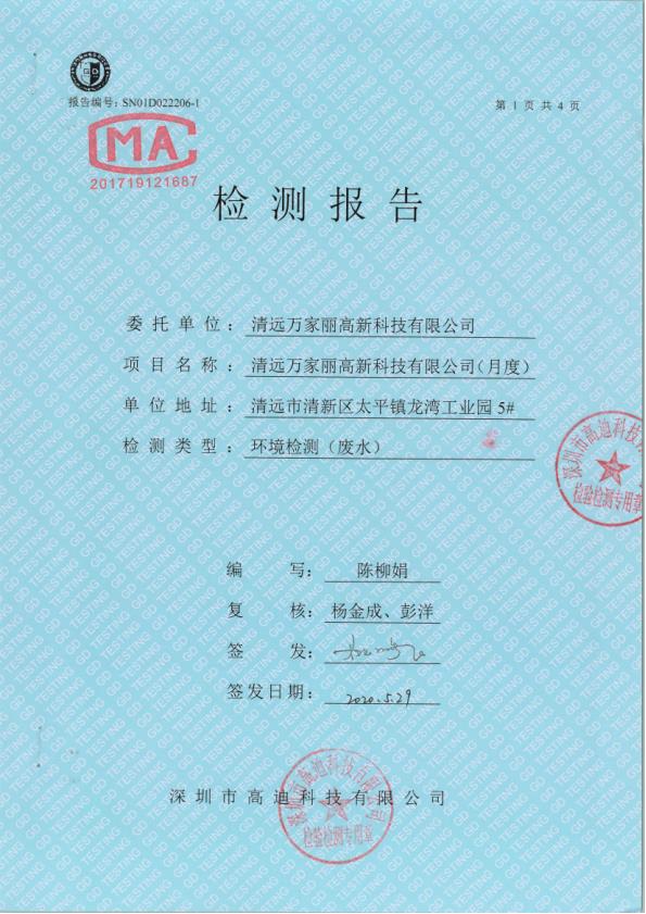 清远万家丽高新科技有限公司2020年5月废水