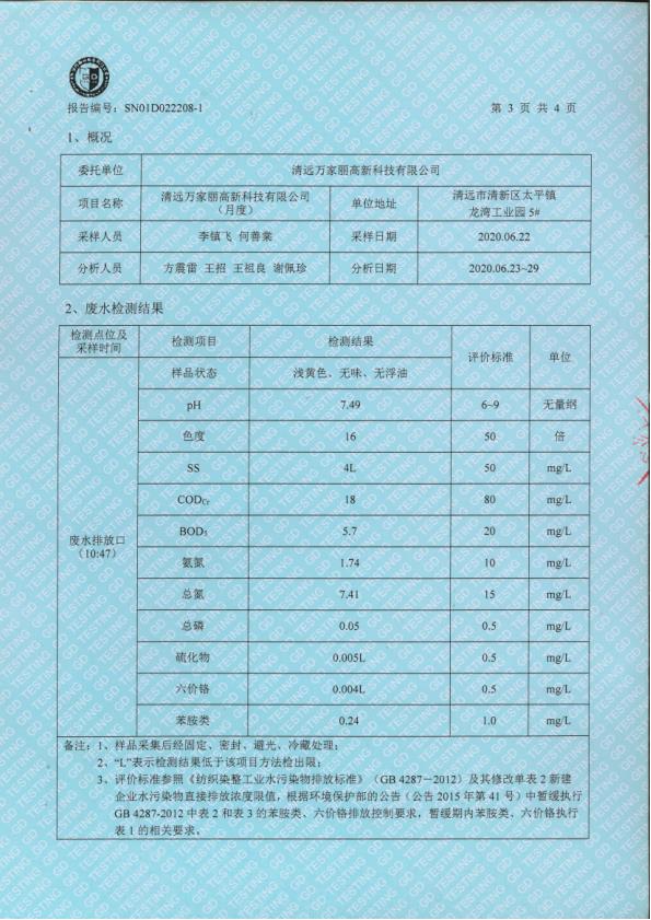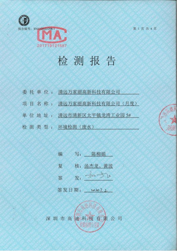 清远万家丽高新科技有限公司2020年6月份废水监测报告