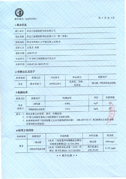 清远万家丽高新科技有限公司2020年3季度监测的废水二项报告