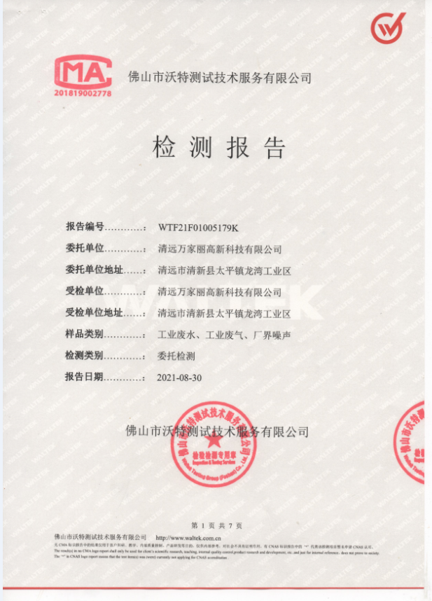 [上一篇] 清远万家丽高新科技有限公司2021年7月份废水、废气监测报告