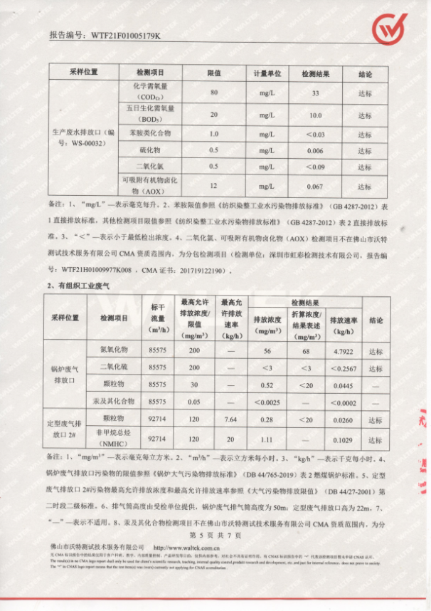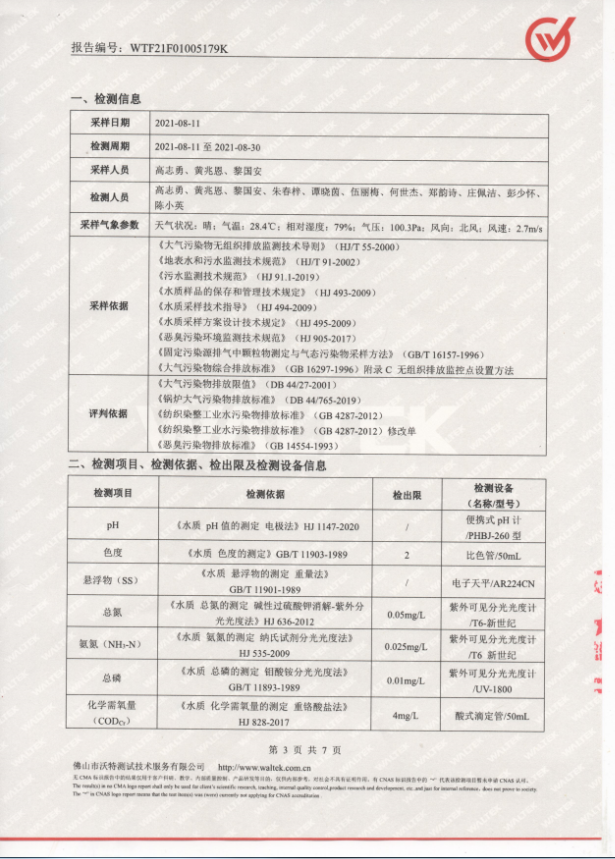 清远万家丽高新科技有限公司2021年8月份废水、锅炉废气和定型机有机废气监测报告