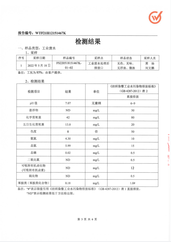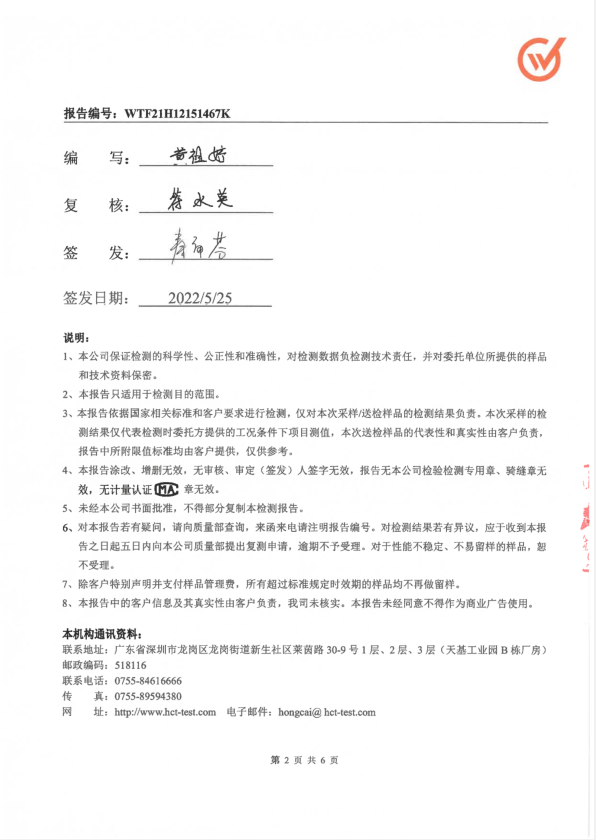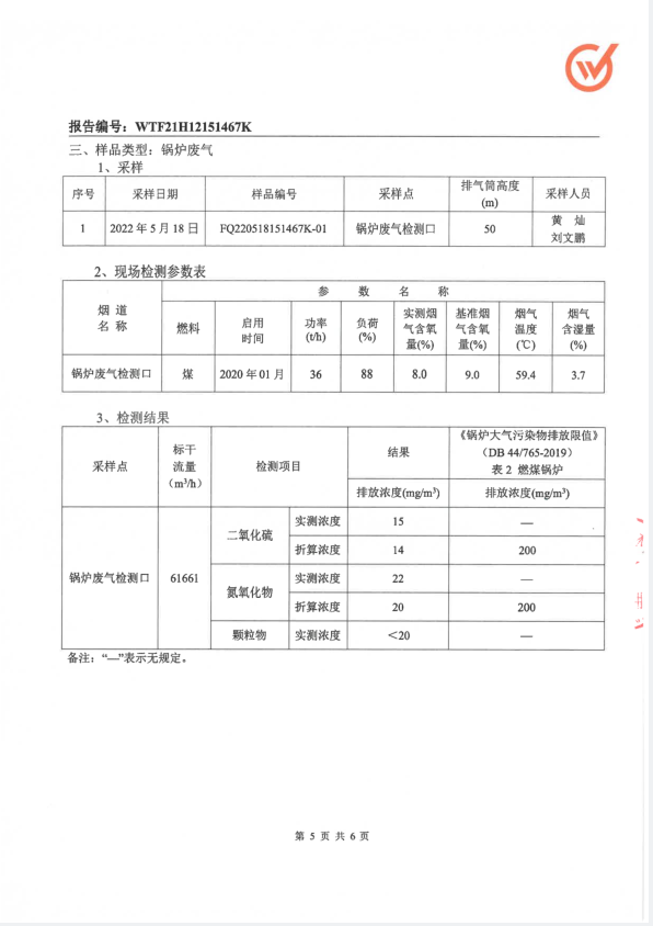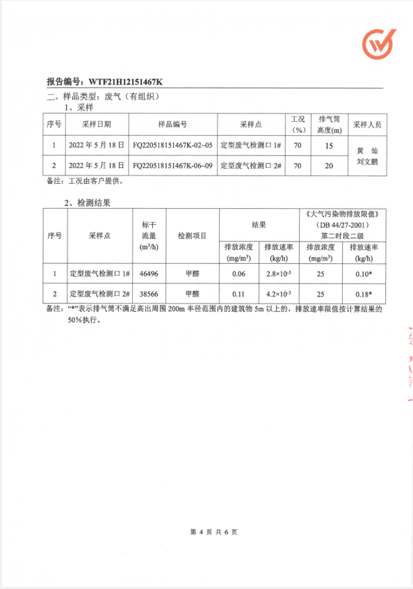 清远万家丽高新科技有限公司2022年5月份废水、废气监测报告