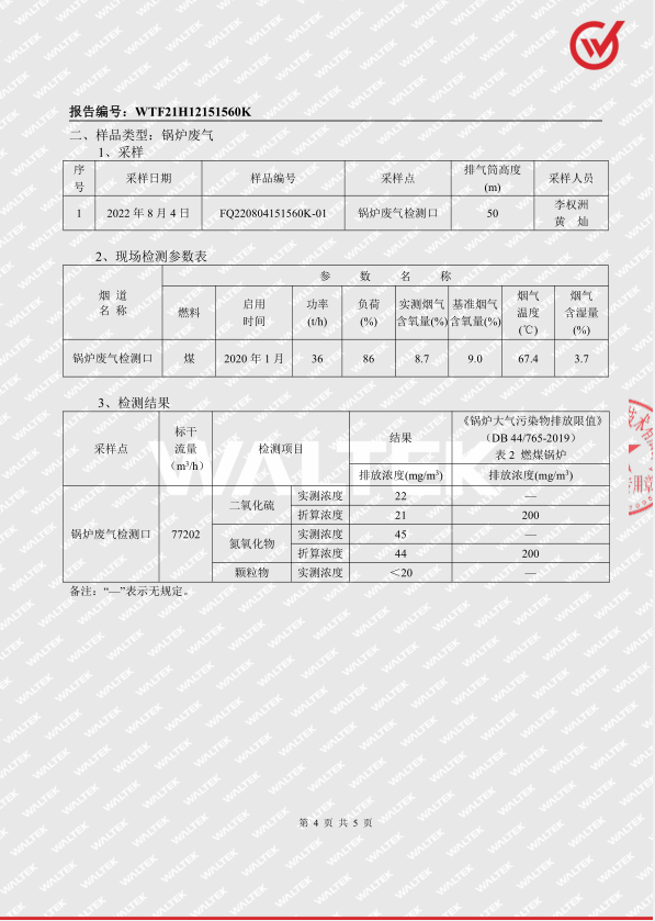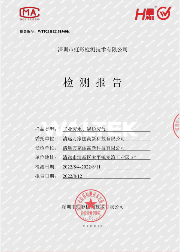清远万家丽高新科技有限公司2022年8月份废水、锅炉废气监测报告